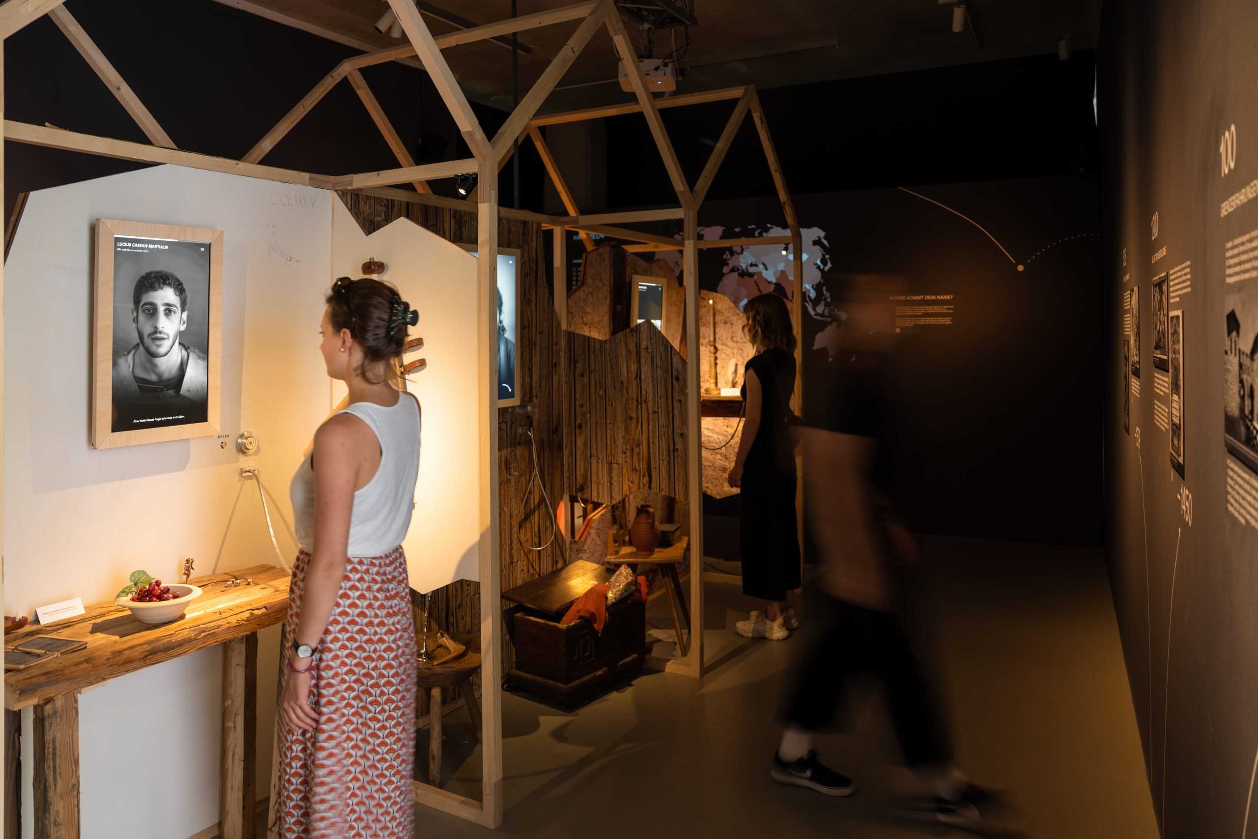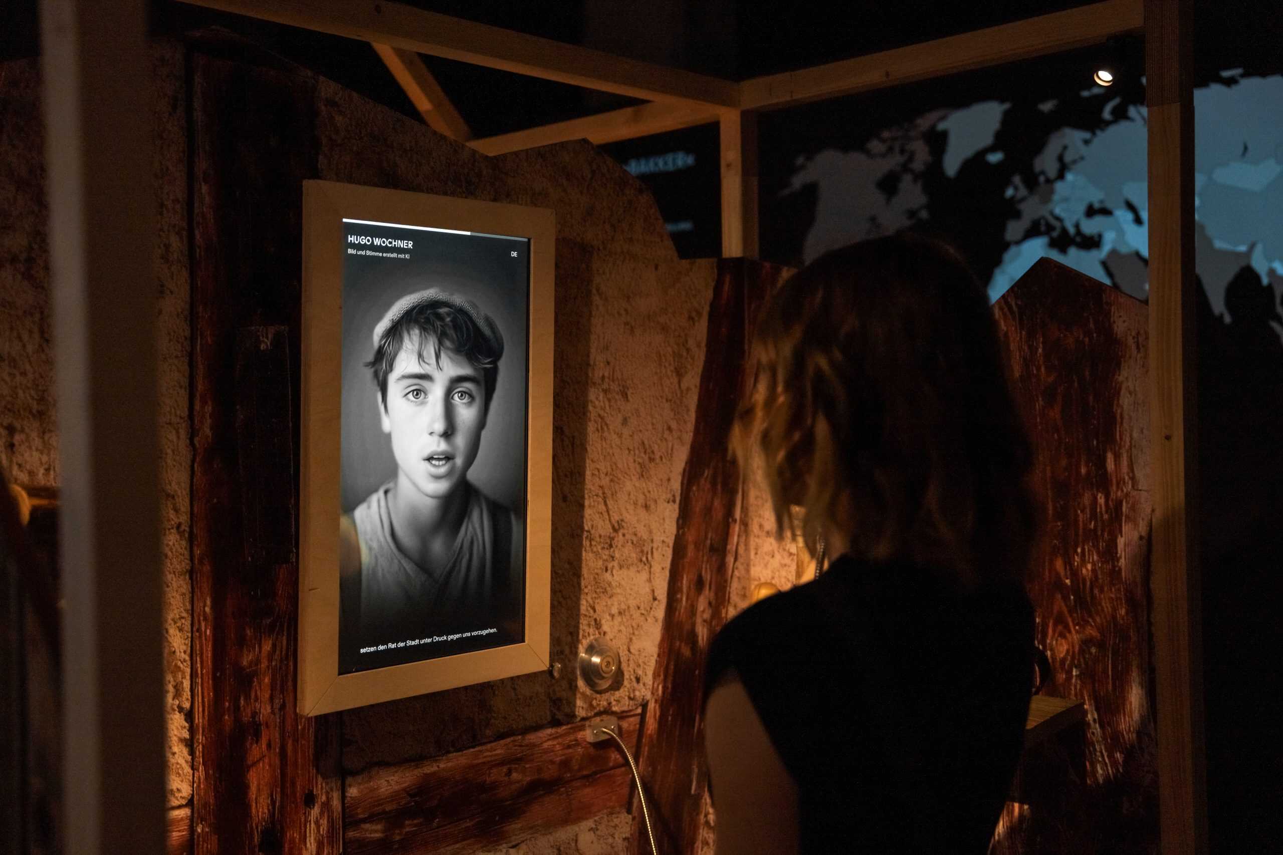 Im Erdgeschoss lernen die Besucher:innen sechs individuelle Lebenswege kennen – Menschen mit unterschiedlichen Hinter- und Beweggründen. Was führte sie dazu, ihr Zuhause zu verlassen? Die vorgestellten Charaktere beruhen auf historischen Vorbildern und werden mithilfe von KI-Bildern und Stimmen lebendig.