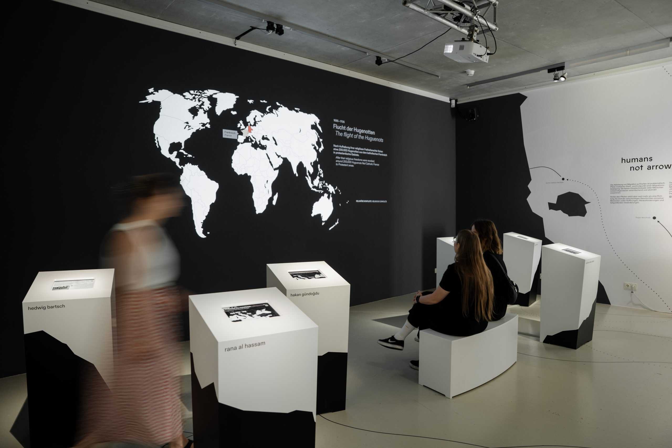 Im ersten Obergeschoss können Besucher:innen die Migrationsrouten der Charaktere nachverfolgen. Durch interaktive Karten werden die unterschiedlichen Routen sichtbar. Eine animierte Weltkarte zeigt Migrationsbewegungen aus verschiedenen Jahrhunderten und über die gesamte Welt verteilt.