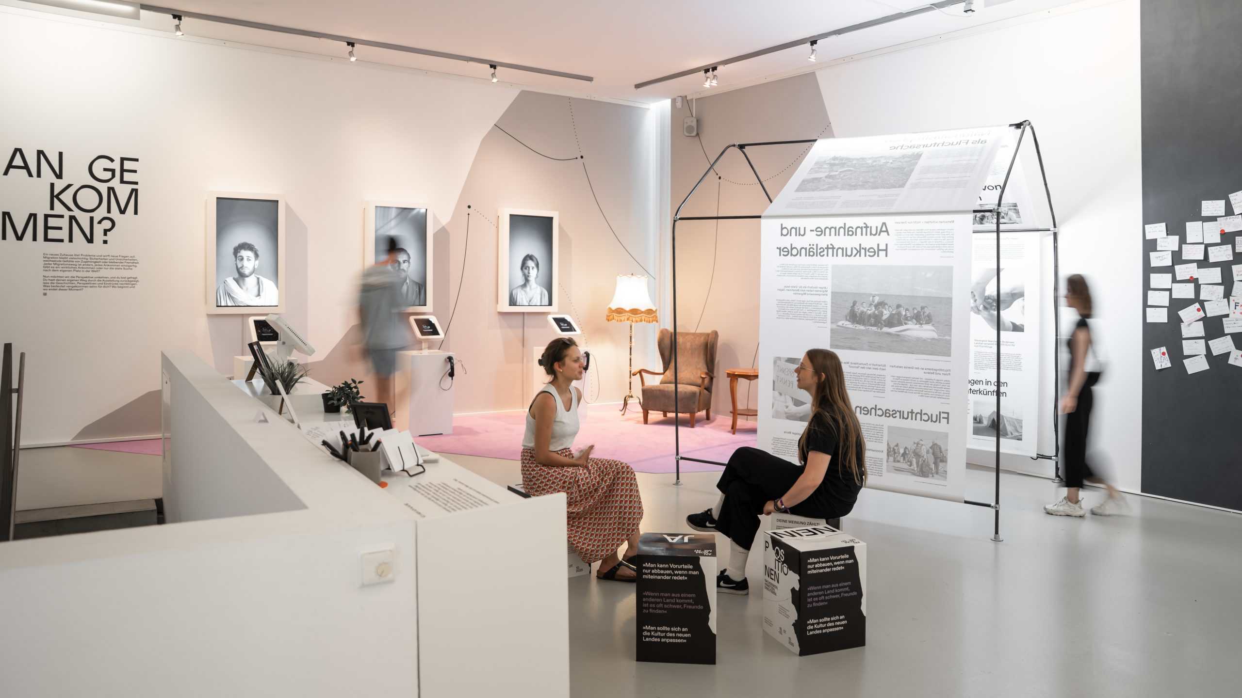 Das letzte Stockwerk widmet sich der Frage, was es bedeutet, wirklich angekommen zu sein. Hier können sich Besucher:innen mit den KI-animierten Charakteren über ihr Schicksal unterhalten. Alle Charaktere sind inzwischen gealtert und blicken zurück auf ihre Reise und die damit verbundenen Erfahrungen. Die Gestaltung in diesem Stockwerk öffnet den Raum für Dialog: Was ist für dich Heimat? Was bedeutet es für dich angekommen zu sein?